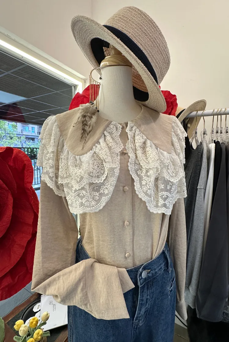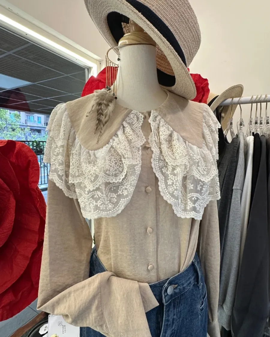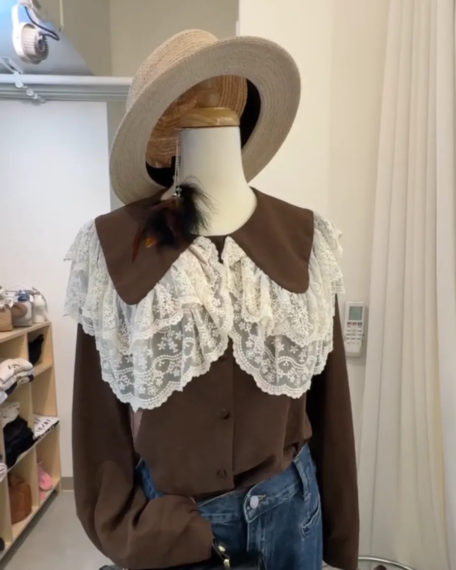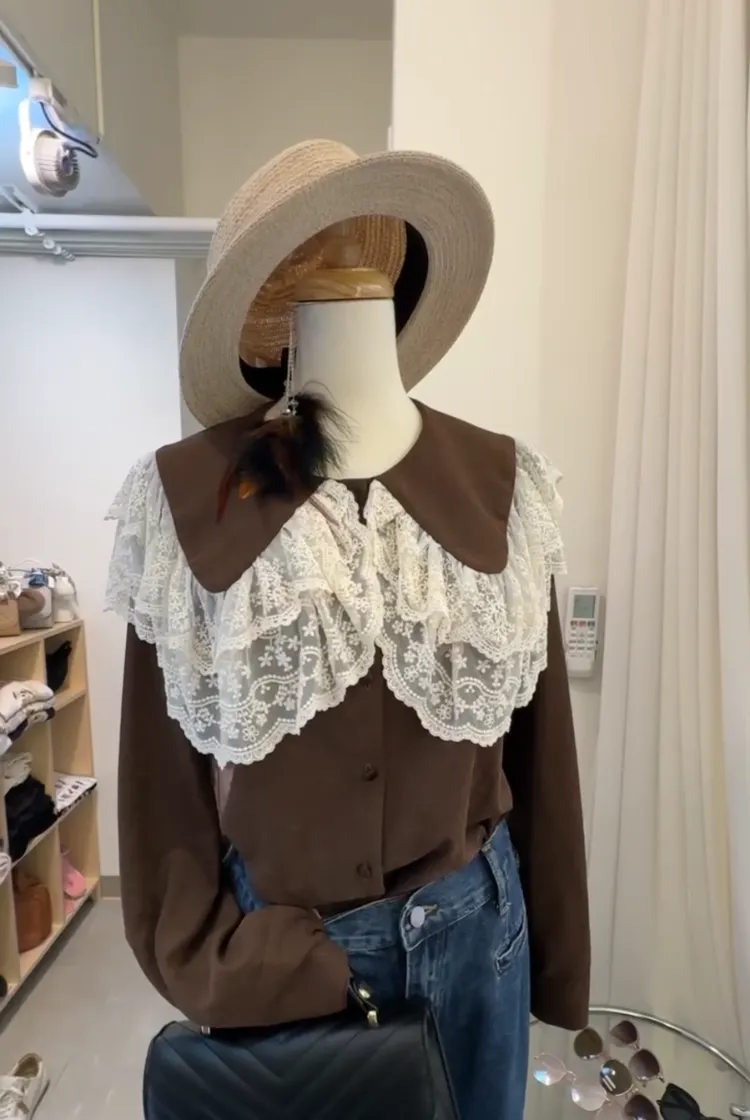 法式蕾絲大翻領深咖襯衫